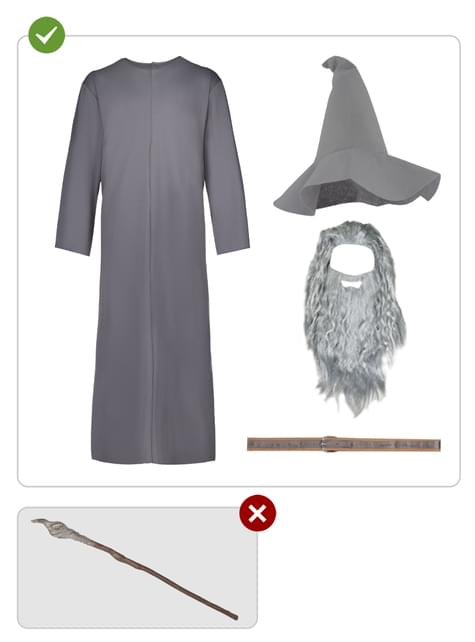 Ten strój zawiera tunikę, pasek, kapelusz i perukę. Szara tunika z długim rękawem wykonana jest z lejącego poliestrowego materiału, zapewniającego wygodę i swobodę ruchów, natomiast regulowany brązowy pasek pomaga dopasować ubiór. Spiczasty kapelusz i peruka z długą siwą brodą dopełniają wygląd, by nie zabrakło żadnego detalu. Laska nie jest w zestawie.