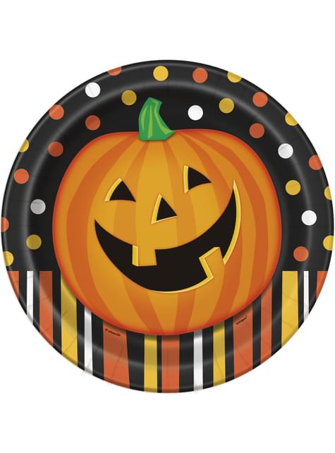 Zestaw 8 okrągłych talerzy z uśmiechniętą dynią w kropki i paski - Smiling Pumpkin