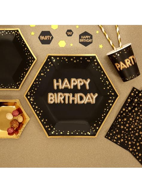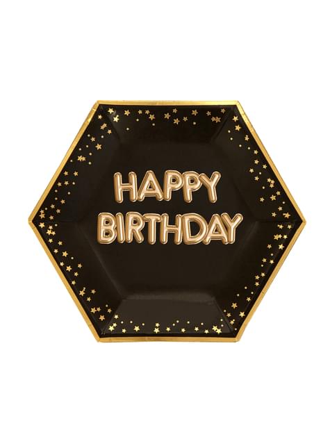 Zestaw 8 sześciokątne papierowe talerze “Happy Birthday” - Glitz & Glamour Black & Gold