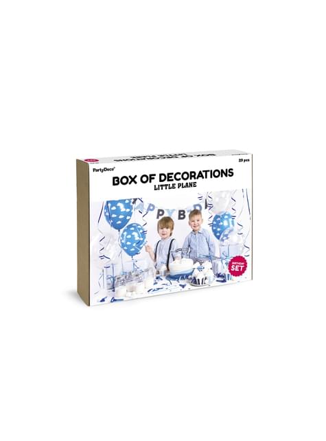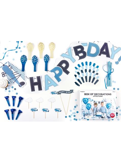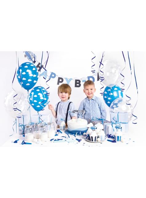Zawiera: 1 dekorację tortu, 1 banner, 6 dekoracji babeczek, 6 foremek na muffinki, 6 gwizdków, 6 balonów, serpentyny i 1 satynową wstążkę
